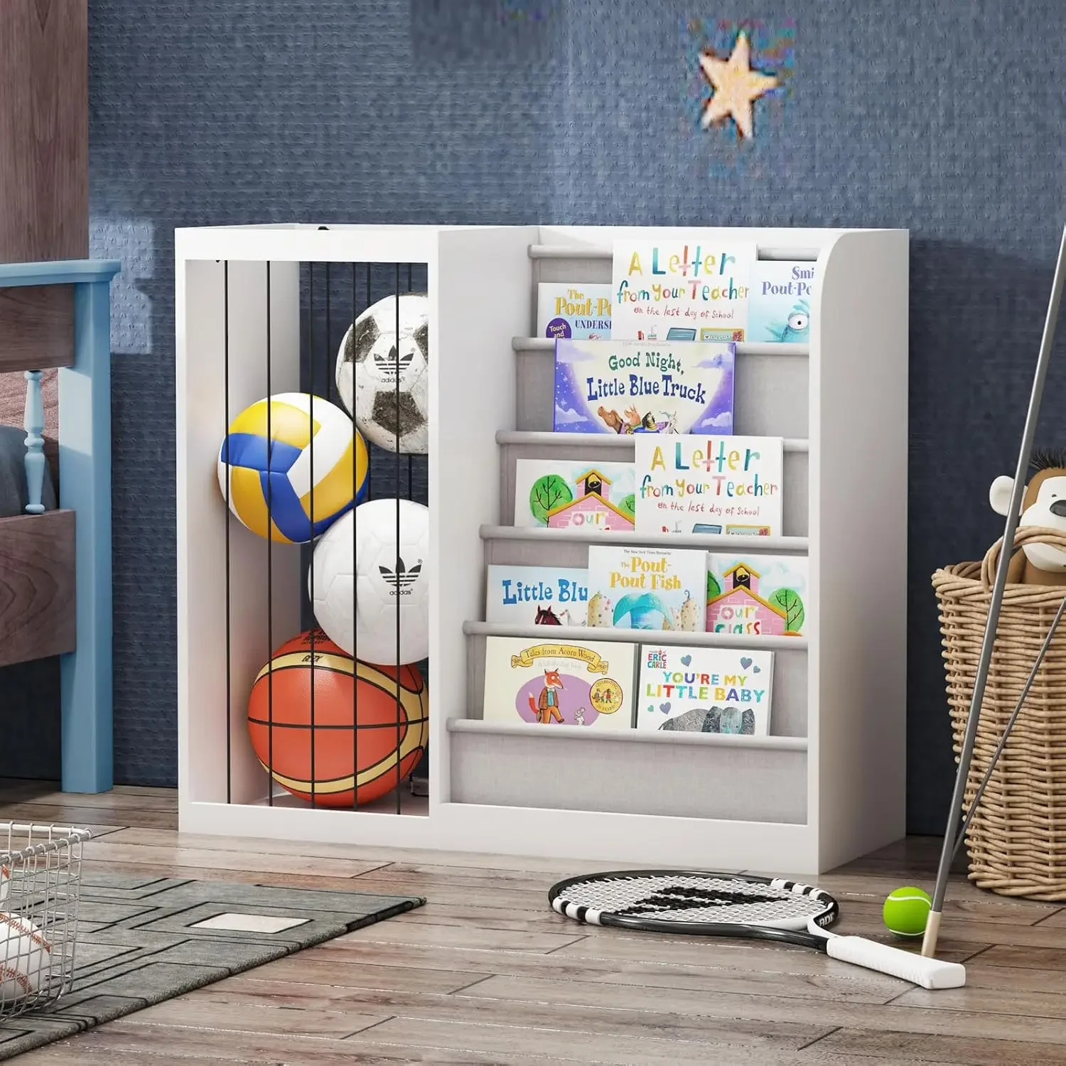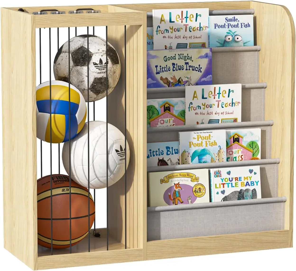 Wood Kids Bookshelf & Stuffed Animal Net Holder Plush Toy Storage Organizer Child Bookcase Toddler Baby Sling Book Rack